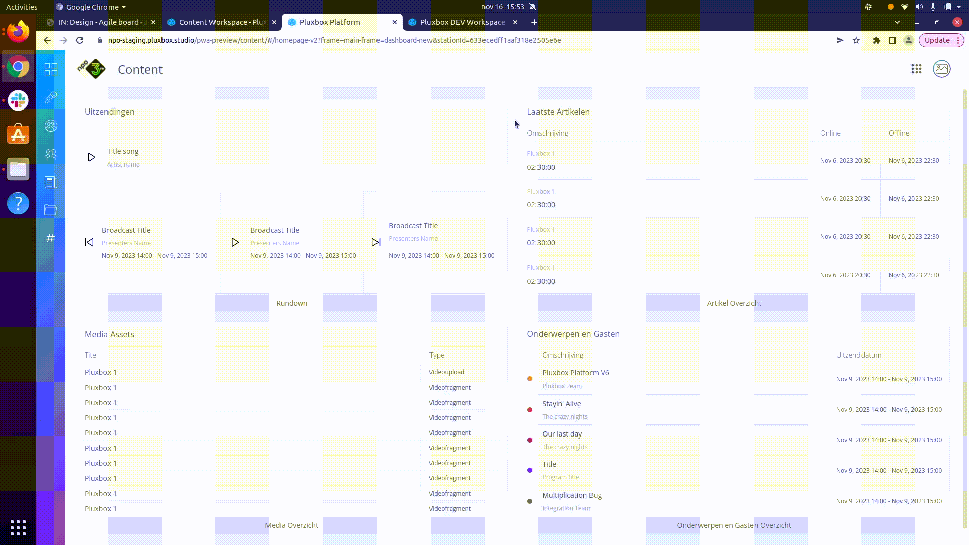 Inside NPO - Content we can find a dashboard, rundown, subjects and guests, contacts, articles, media and social overviews.