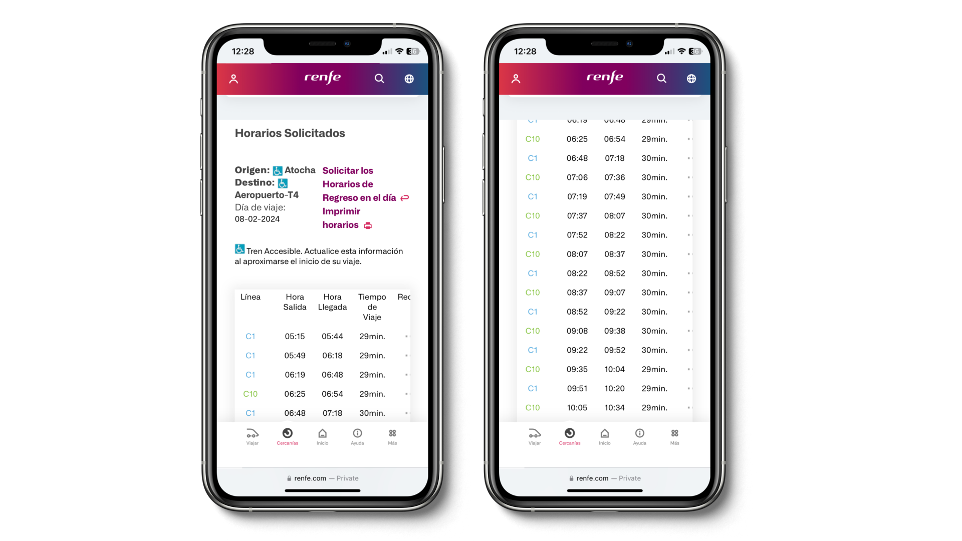 Users should carry out the task "search for trains from Atocha to Aeropuerto T4 for February 6th between 05:00 am and 08:59 am and in the result invert the origin and destination".