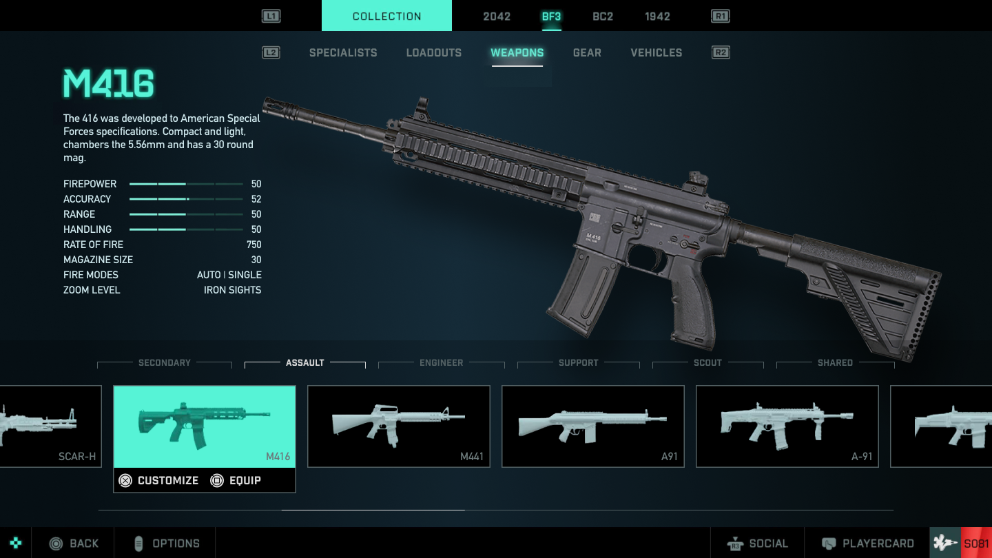 We will observe the weapon that we are seeing thanks to a color change and the possibility of customizing and equipping that weapon with the action buttons.We also have an indicator (scrollbar) that shows us if we have more weapons ahead or behind where we are.